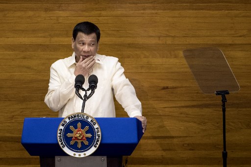 Philippine President Rodrigo Duterte gestures as he delivers his state of the nation address at Congress in Manila on July 23, 2018. / AFP PHOTO / NOEL CELIS