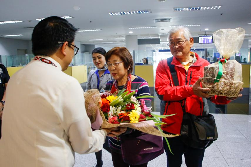 DOT Assistant Secretary for Tourism Development Roberto P. Alabado III (left) welcomes Japanese Yachiyo Imamoto (middle), the country’s eight-millionth tourist this year with her husband Tamio (right). Photo courtesy of DOT
