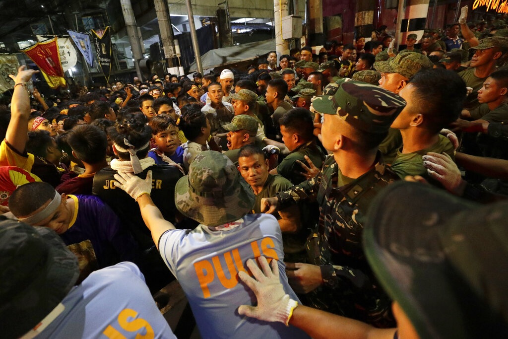 Filipino Roman Catholic devotees are pushed by police and military as they try to break the barriers to go near the carriage of the Black Nazarene during a raucous procession to celebrate its feast day Thursday, Jan. 9, 2020, in Manila, Philippines. A mammoth crowd of mostly barefoot Filipino Catholics prayed for peace in the increasingly volatile Middle East at the start Thursday of an annual procession of a centuries-old black statue of Jesus Christ in one of Asia’s biggest religious events. (AP Photo/Aaron Favila)