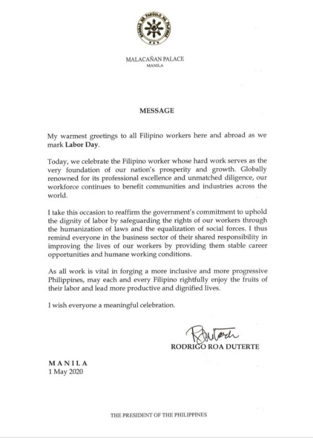 In his message Friday, Duterte vowed that the government will continue to safeguard workers’ rights as he hailed their contribution to the nation.