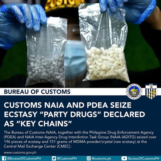 In a statement, BOC said its team in Ninoy Aquino International Airport (NAIA), Philippine Drug Enforcement Agency, and NAIA-Inter Agency Drug Interdiction Task Group seized 196 pieces of ecstasy and 151 grams of MDMA powder/crystal (raw ecstasy) at the Central Mail Exchange Center in Pasay.