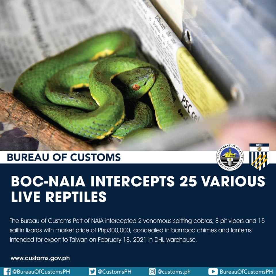 MANILA, Philippines — Twenty-five exotic animals with an estimated value of P300,000 were seized inside a parcel consigned to a Taiwanese national, the Bureau of Customs (BOC) said Saturday.