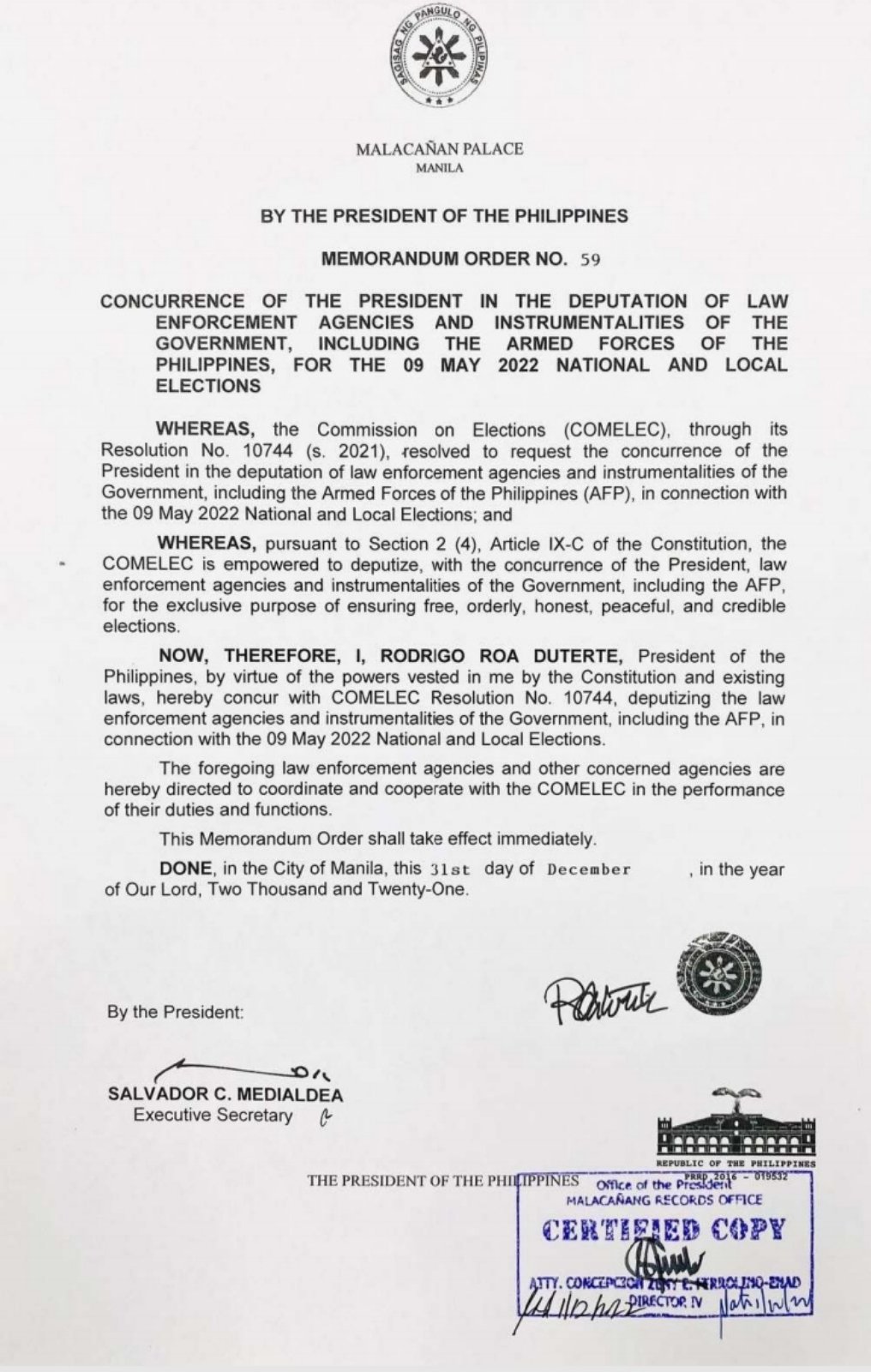 “Now, therefore, I, Rodrigo Roa Duterte, President of the Philippines, by virtue of the powers vested in me by the Constitution and existing laws, hereby concur with COMELEC Resolution No. 10744, deputizing the law enforcement agencies and instrumentalities of the Government, including the AFP, in connection with the 09 May 2022 National and Local Elections,” the memorandum read.