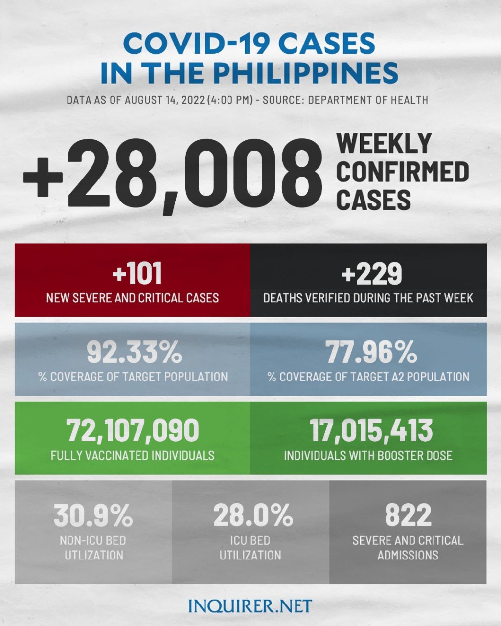 MANILA, Philippines — A total of 28,008 infections of COVID-19 were logged by the Department of Health (DOH) from August 8 to 14, slightly higher than the previous week’s 27,331.