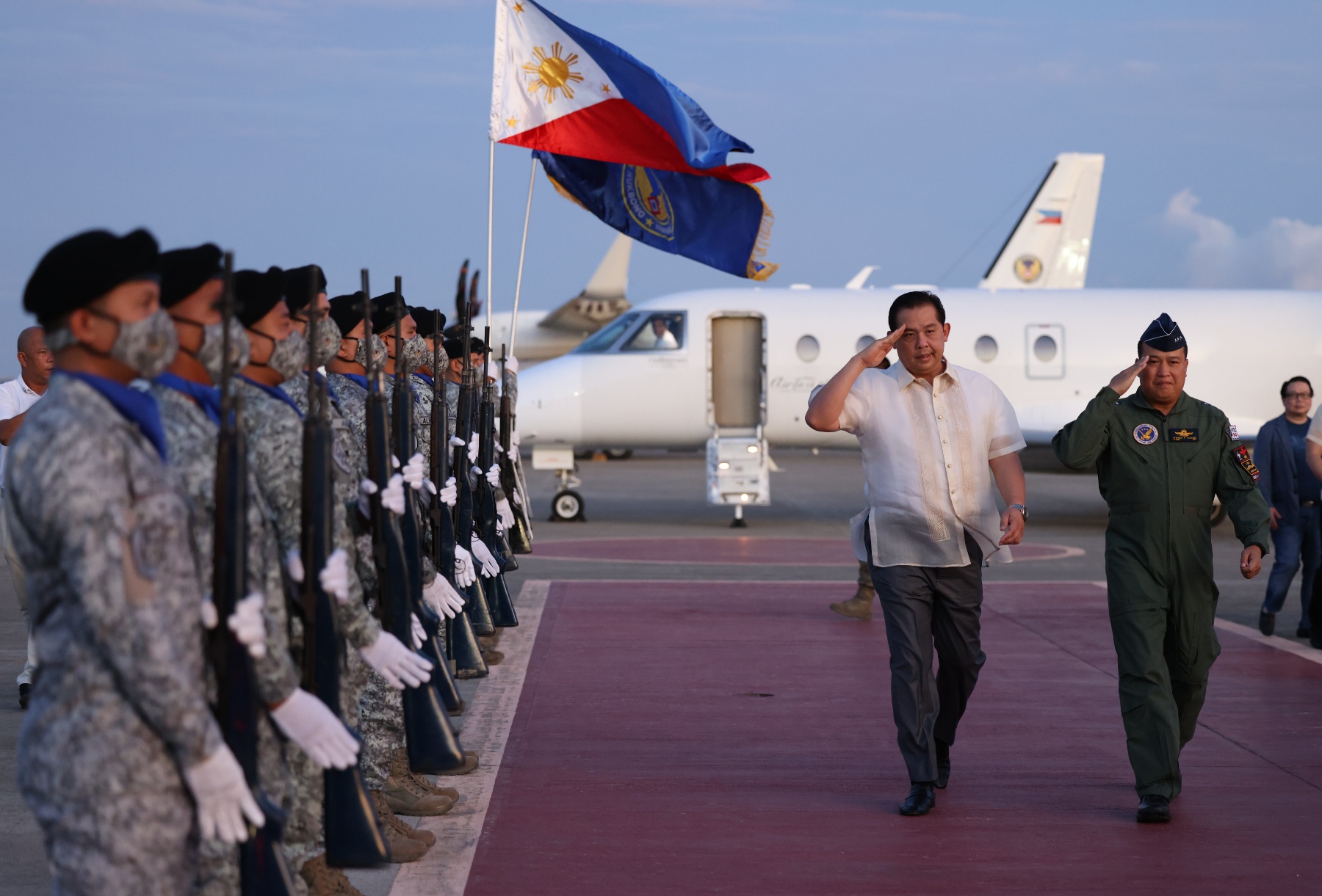 House Speaker Ferdinand Martin Romualdez with Philippine Air Force Commander Lt. General Stephen Parreño executing a hand salute to the honor guards during the arrival honor at the Mactan Air Force Base in Cebu on Thursday, March 30, 2023. (Photo from House Speaker Ferdinand Martin Romualdez)