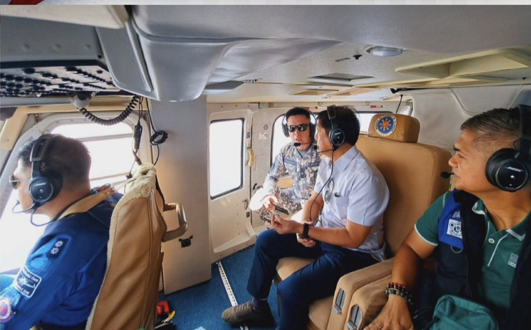 President Ferdinand “Bongbong” Marcos Jr. conducts an aerial survey of areas struck by the oil spill in Oriental Mindoro on Saturday, April 15, 2023. (Photo from Bongbong Marcos’ Instagram)