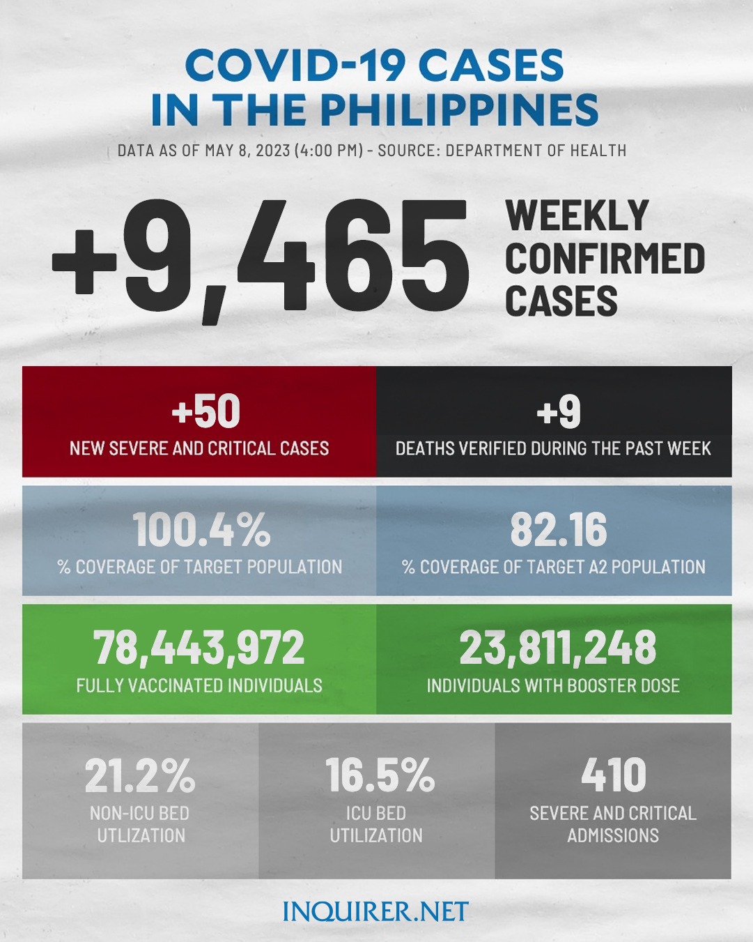 MANILA, Philippines — The Department of Health (DOH) on Monday said it logged 9,465 new COVID-19 infections from May 1 to 7, twice the number recorded the previous week which was only at 4,456.