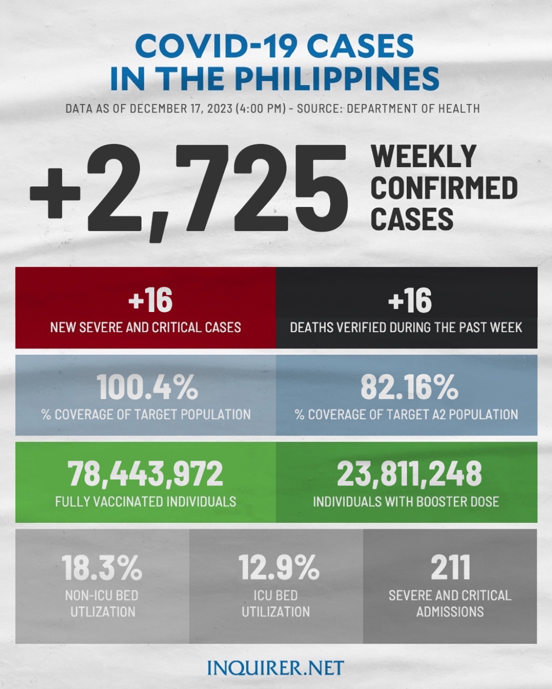 Furthermore, DOH said that there were 211 critical or severe patients admitted to hospitals on December 17.