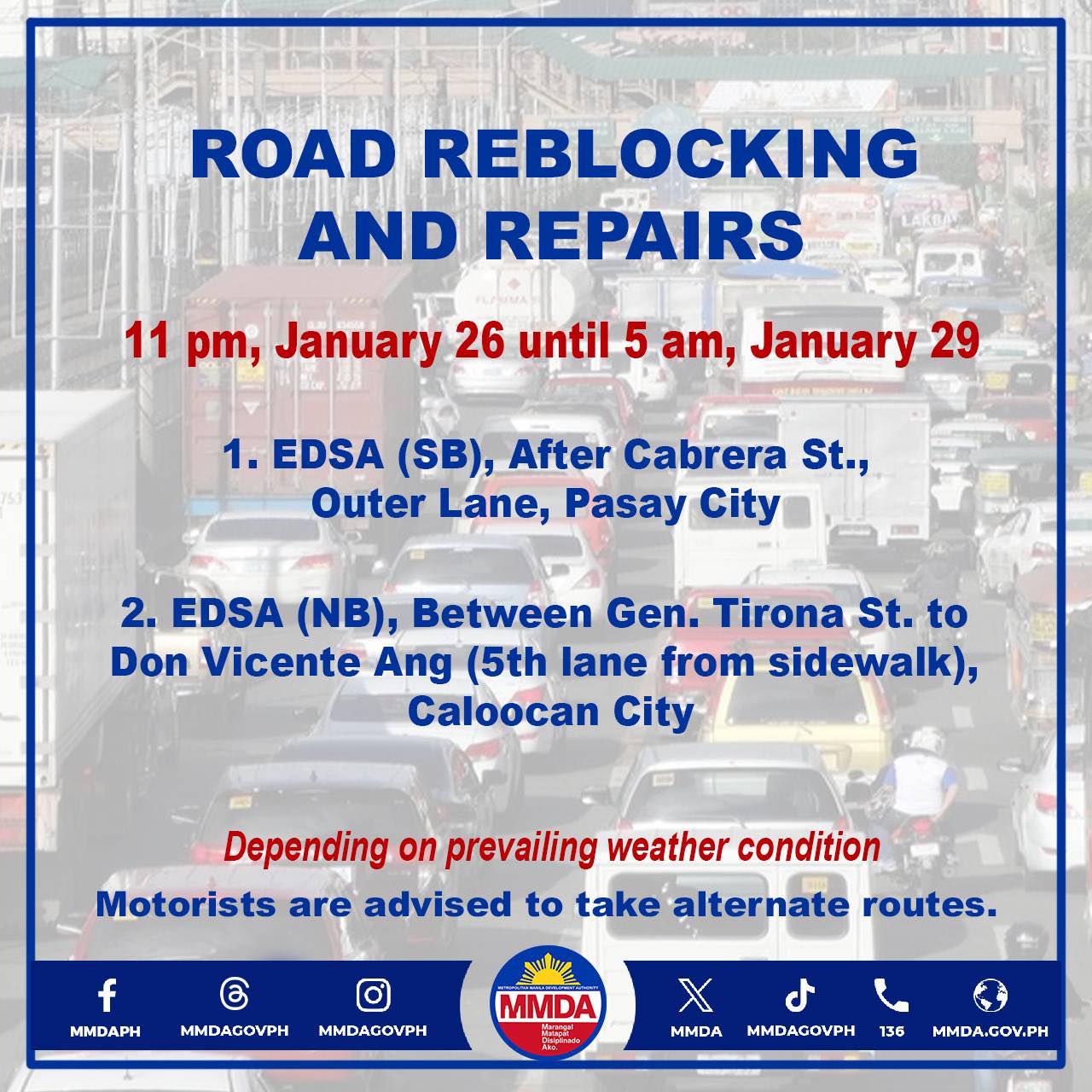 The Department of Public Works and Highways will conduct repair and reblocking works in Pasay City and Caloocan City starting 11 p.m. on Friday, January 26 until 5 a.m. on January 29. (Photo courtesy of MMDA)