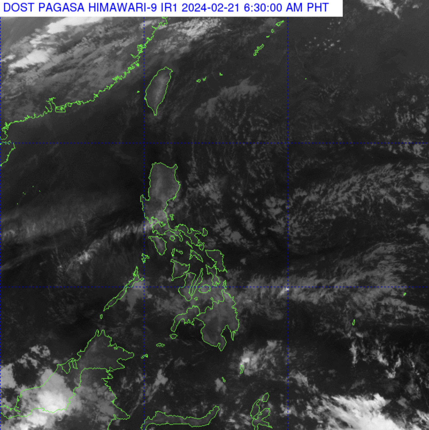 The warm easterlies continue to blow from the Pacific Ocean, bringing rains over the country’s eastern portion on February 21, 2024, as seen on the latest satellite image of the Philippine Atmospheric, Geophysical and Astronomical Services Administration. (Photo from Pagasa)