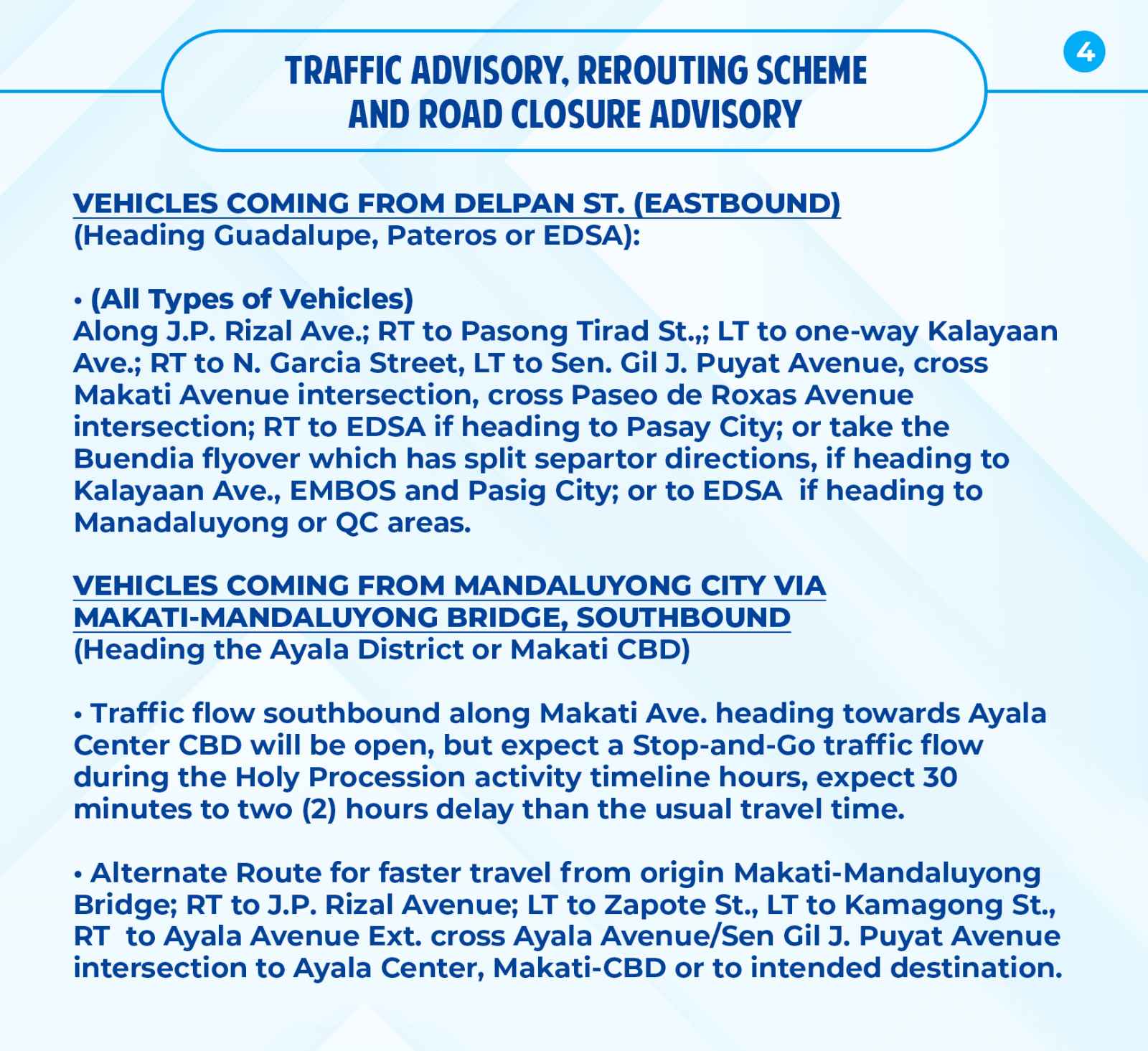 The advisory said that the traffic flow southbound along Makati Avenue heading towards Ayala Center CBD will be open, but motorists may expect a stop-and-go traffic flow during the Holy Procession.