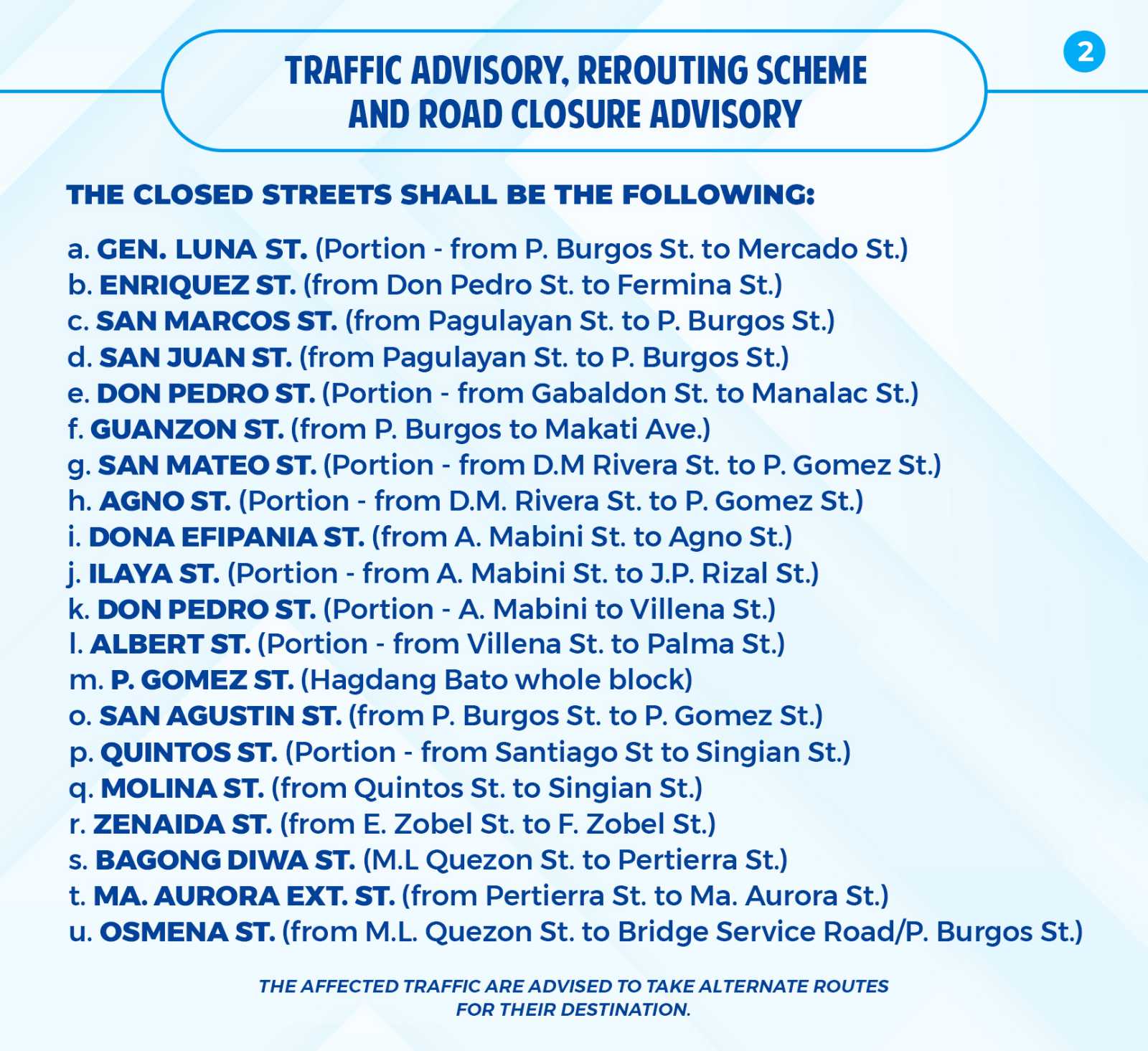The following streets in Barangay Poblacion shall be closed to traffic during and a week before the official Holy Week observance due to the construction of “kubols” (makeshift chapels of various samahan duly recognized by the parish):