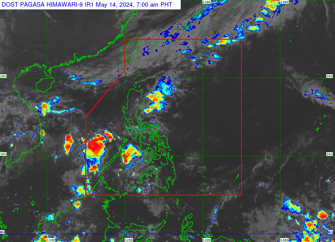 Pagasa forecasts cloudy skies and rain in extreme northern Luzon, while generally fair weather is expected in the rest of the country on Tuesday, May 14. | Satellite photo from Pagasa