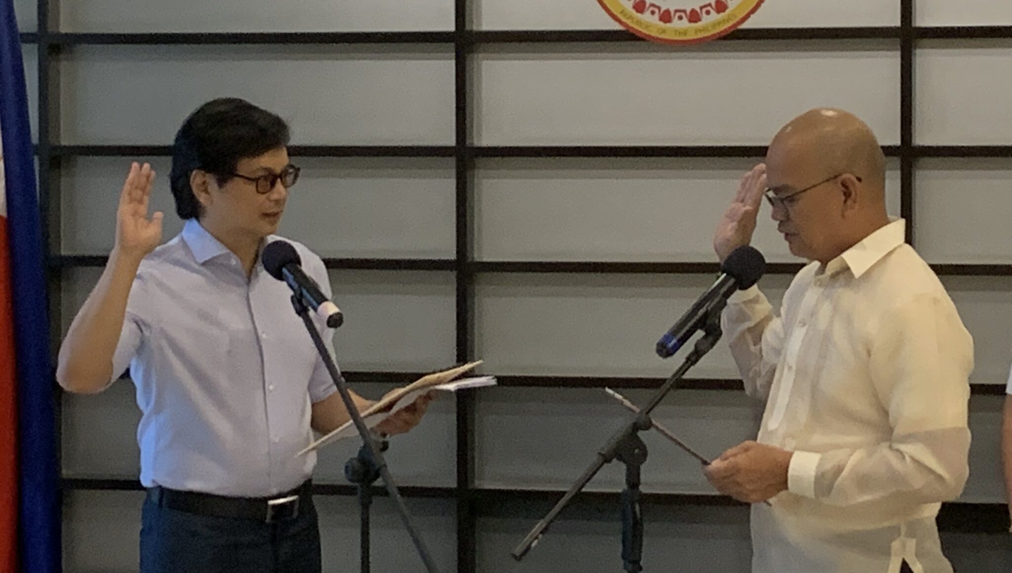 Bamban town councilor Erano Timbang (right) takes oath before Interior Secretary Benjamin Abalos Jr. (left) as he assumes mayoralty post temporarily, replacing former mayor Alice Guo who was dismissed by Ombudsman over Philippine offshore gaming operator links. INQUIRER.net / John Eric Mendoza
