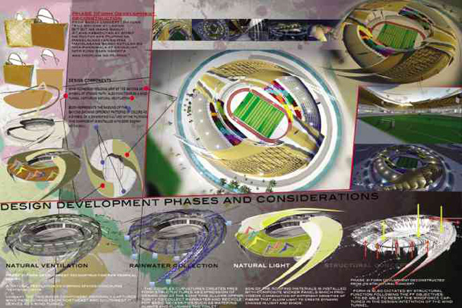 Par used the Filipino characteristic of baduy as a base concept for her design. She picked the bayong (native basket) as the epitome of baduy and the inspiration for her “Football Stadium and Olympic City.”