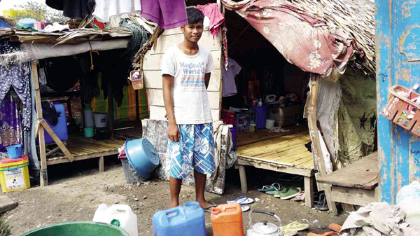 RAYMOND Amil, a 23-year-old Badjao teacher, outside his family’s shack at the Don Joaquin Enriquez Memorial Sports Complex, which is home to thousands of evacuees JULIE S. ALIPALA