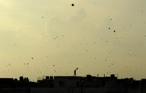 In this Aug. 15, 2013 file photo, a boy flies a kite from the roof of a house as other kites seem to flock in the sky above as Indians celebrate Independence Day in New Delhi, India. Indian police say three people, including two children, have died after their throats were slashed by glass-coated kite string used in competitions to slice the strings of other kites.The deaths occurred in New Delhi on Monday, which was a holiday on account of India’s Independence Day when people fly kites to celebrate. AP