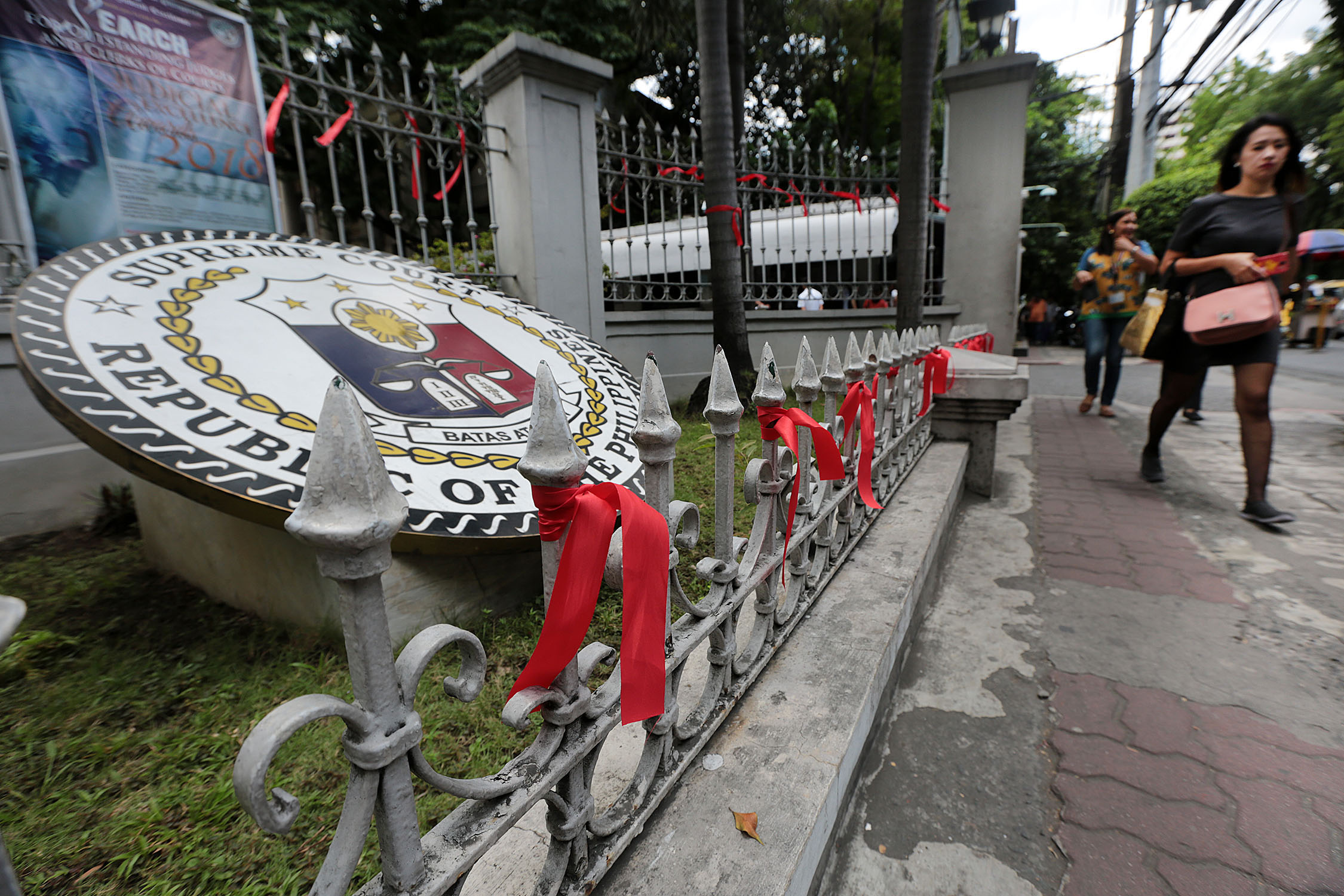RED RIBBONS / MAY 10, 2018Pedestrians walks pass the gate of Supreme Court in P. Faura, Manila laced with red ribbons on Thursday, May 10, 2018 a day after embattled Chief Justice Maria Lourdes Sereno returned to her office ending her indefinite leave of absence.INQUIRER PHOTO / GRIG C. MONTEGRANDE